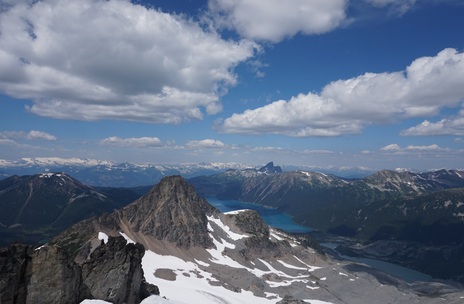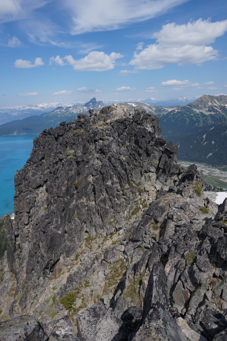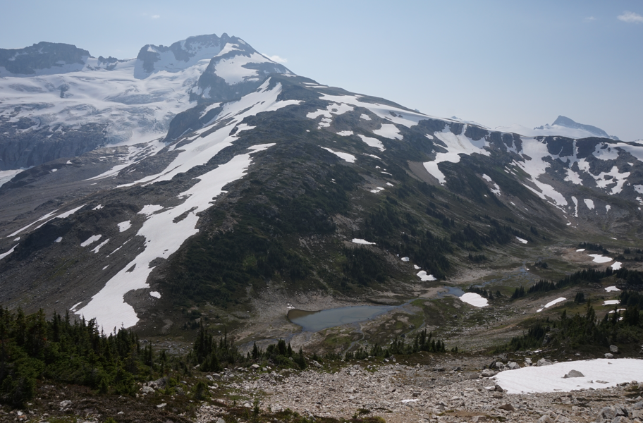 I weaved my way out of the pass and up the meadows south slopes of Gentian Peak. Carrying all my gear, I crossed over Gentian Peak, which offered great views of the lake and Panorama Ridge, but it was getting a bit hazy.