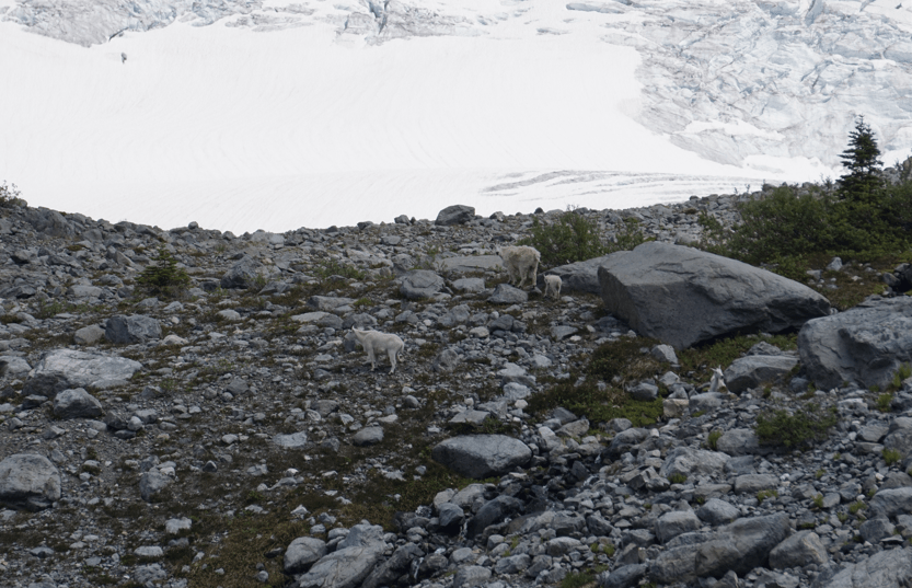 I made quick time dropping elevation down the small glacier originating from the Deception – Guard col, and then took a break photographing a small family of goats below the shattered Sphinx Glacier.