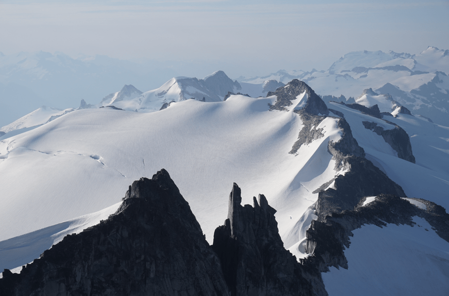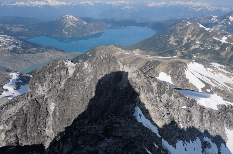 On the plateau area are two seemingly equal summits – I climbed both for fun, getting grand views to places I’d visits years before around Garibaldi Neve. The scrambles here required some thinking but were only 15m long. The descent to the col was fast on the snow, and soon I was shouldering my big bag and boot skiing down the glacier into Sphinx Bay.