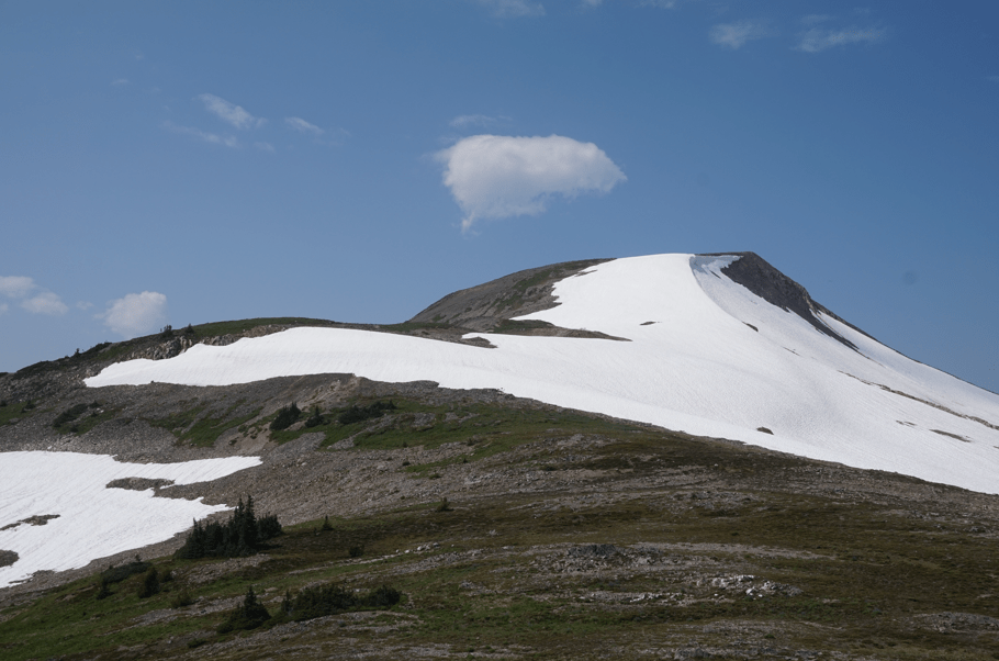 Lack of snacks and the heat has me exhausted and I stagger up the 100m elevation of Table’s long, low, NW ridge. I reach my intended spot, near the top of the ridge and near some snow patches. It is 7:00PM. I am very surprised to find two tents pitched in my intended meadow, but I’m tired and throw my bug net up 50 ft away.