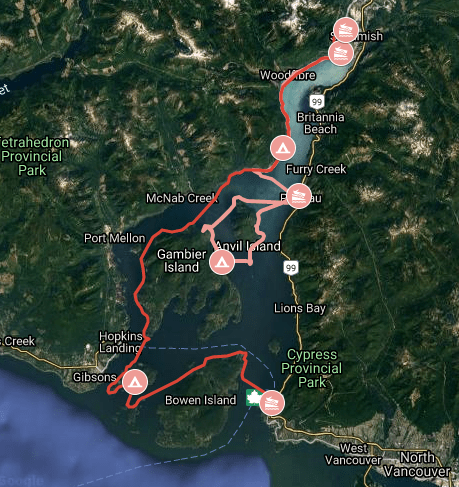 Lindsay and I have previously paddled around Anvil Island, hiking up Leading Peak, and paddled the west side of the inlet from Squamish to Porteau Cove, but I was most keen on checking out the group of islands south of Gambier and West of Bowen.