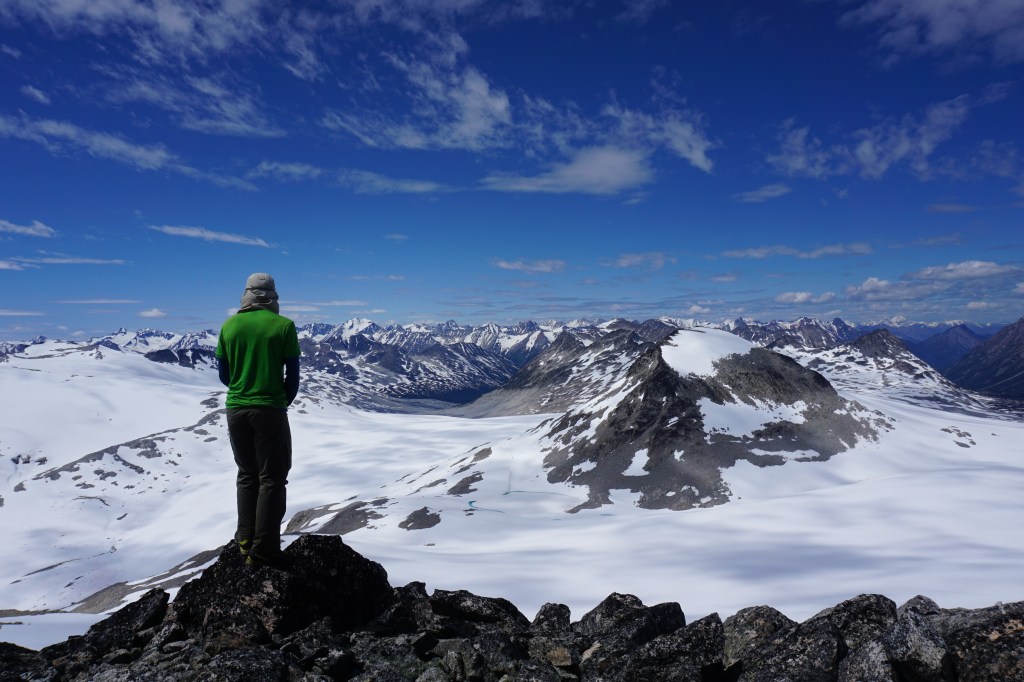 We put everything back in its place and then continued north towards the other peaks. We had to drop a bit, but the elevation loss was minimal and the route was straightforward. The south ridge of Lepton Peak is mostly just a hike on talus, but the last 50m provided some scrambling opportunities and we took advantage. The views from the summit were equally brilliant here.