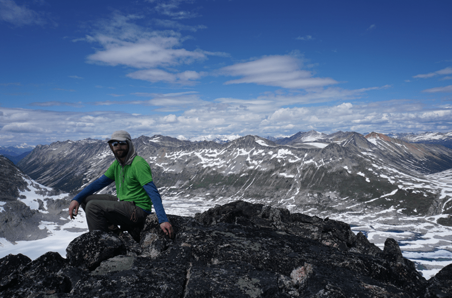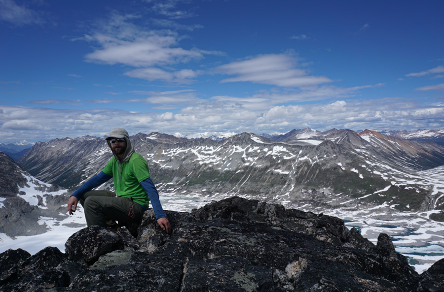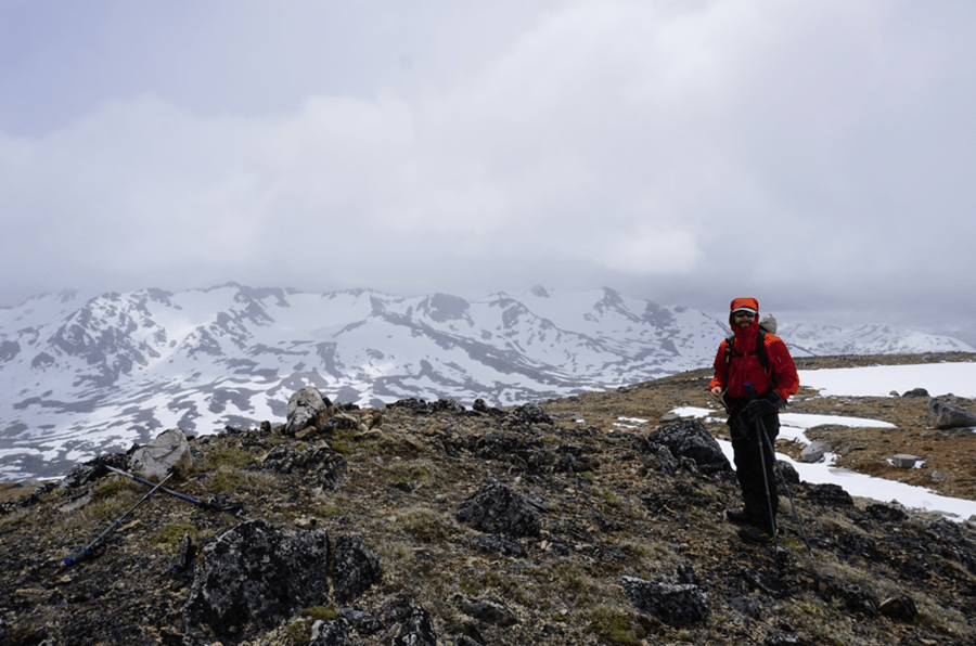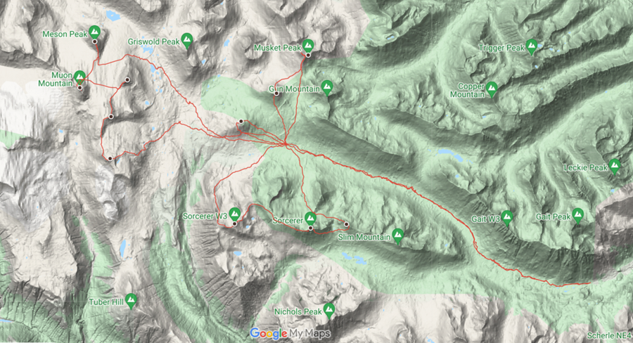 We left camp in the late morning and rambled our way up towards Mount Steve. It was incredibly windy, but the rain held off for the most part. Near the summit, despite the clouds, we got great views towards Griswold Pass and the Subatomic Glacier (where we would head the following day), the Sorcerer Group, and the Gun and Musket area. We were excited for the next couple of days of exploring.