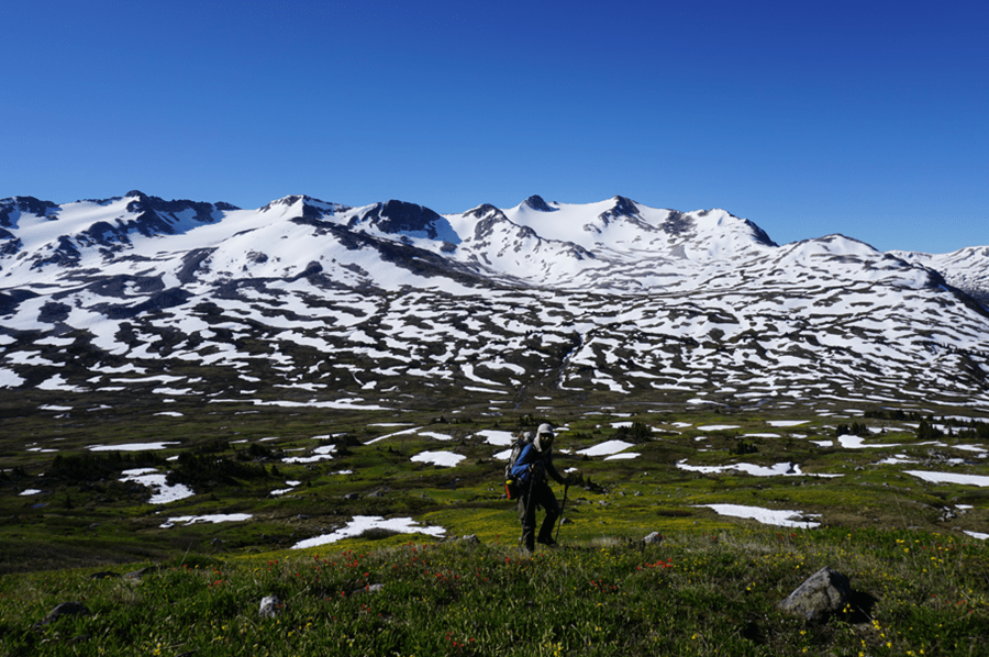 Anyway, we stumbled over meadows and spring snow through Griswold Pass and back to the base of Mount Steve. The light was gorgeous and the flowers and beauty of the area took away from our sore feet. I needed some food so I left Dan behind and rushed back to camp, where I fired up the stove and took off my boots to give my feet a much needed breather.