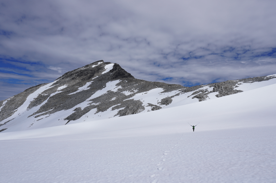 Back at the Lepton-Baryon col, we had a decision to make. We were tired, and if we turned back now we would already have had a big day out with some peaks in the bag. But Muon Mountain and Meson Peak were very close and the day was still early! I managed to convince Dan to cross the glacier and bag the final two peaks!
