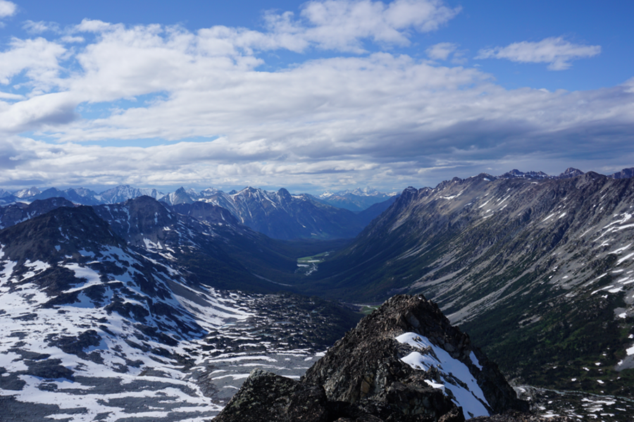We also saved the best views for last. Meson Peak offers a perfect view down the valley that drains Griswold Pass to the NW, as well as a view over the Subatomic Glacier and the countless peaks of the Coast Mountains. The late afternoon light made the setting surreal.