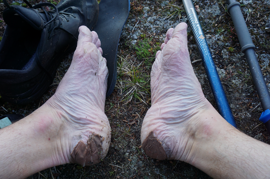 We took a short break on the sandy meadows in the broad valley that drains Griswold Pass to the south. Here we had to take off our boots so we could ford a creek that we could not find an easier way across. The water was cold, but it was a nice break for the feet.