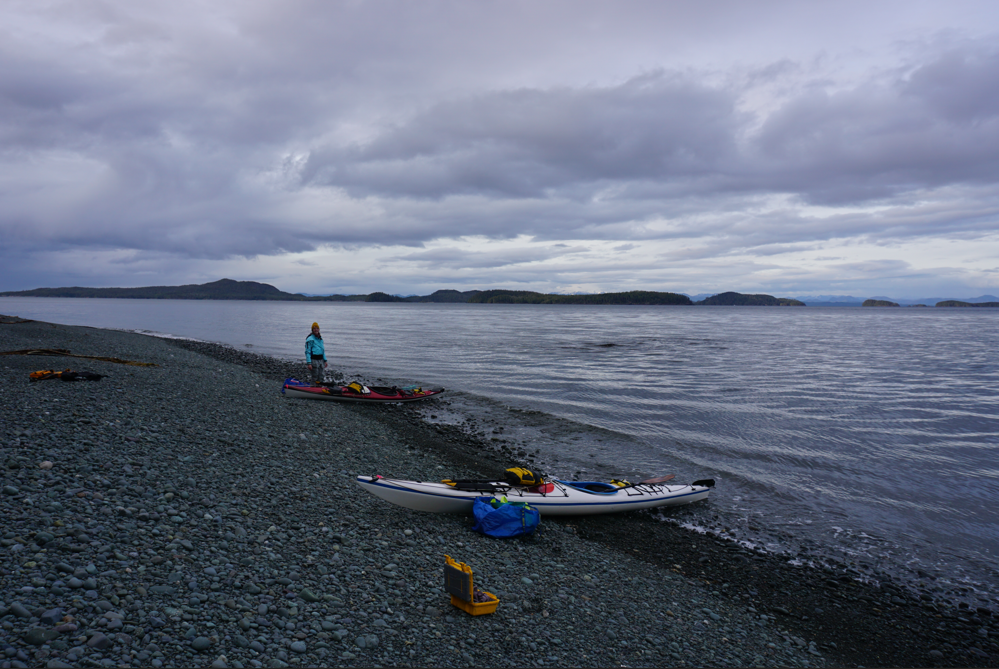 Disappointment awaited at the campsite as we were greeted with a rock wall barring entrance to the midden beach. This feature seemed artificial and is likely the result of the First Nation clearing the beach, although I cannot say for sure at this site. We knew that the site at Bell Island is easy to access at a low tide and decided to continue on a few kilometers. It was raining and still a little windy, but we decided to continue along the outside of Bell Island as we had yet to paddle this shoreline.