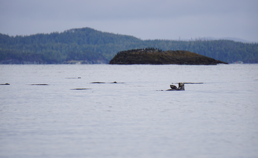 We made our way down Browning towards Queen Charlotte Strait. The rain increased from showers and a dive boat passed us. As we passed the small islets halfway down Browning, the first signs of swell snuck in and greeted us. Sea otters became frequent companions and we weaved our way through kelp gardens and rocky islets.