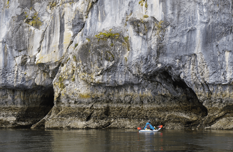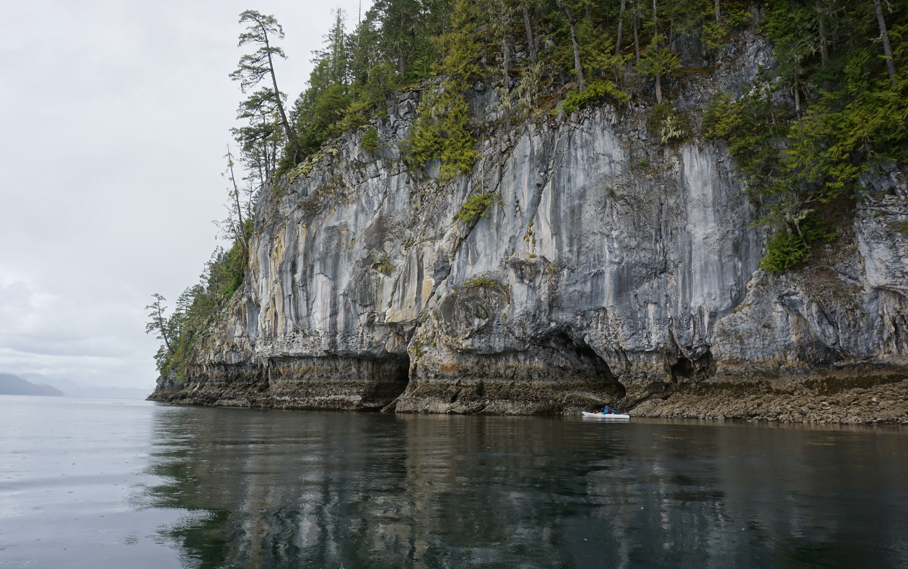 We crossed back to the shoreline near Hankin Point and paddled past more limestone cliffs and cool features. From here it was a simple paddle back to Stewart Point and across to Coal Harbour. We could hear a humpback somewhere out in the inlet, but only caught occasional spouts. Unloading the kayaks went smoothly and we were fortunate enough to witness how they get the floatplanes out of the water – picked up from the ramp with a custom forklift.