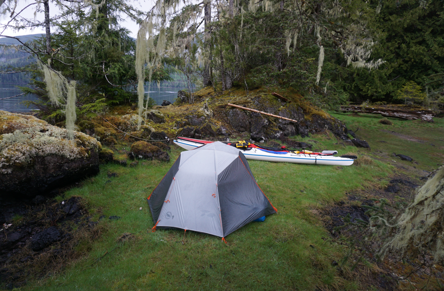 The BCMT campsite in Pamphlet Cove on Drake Island – I would recommend putting the tent where L is sitting or in the forest, and NOT on the intertidal grass!