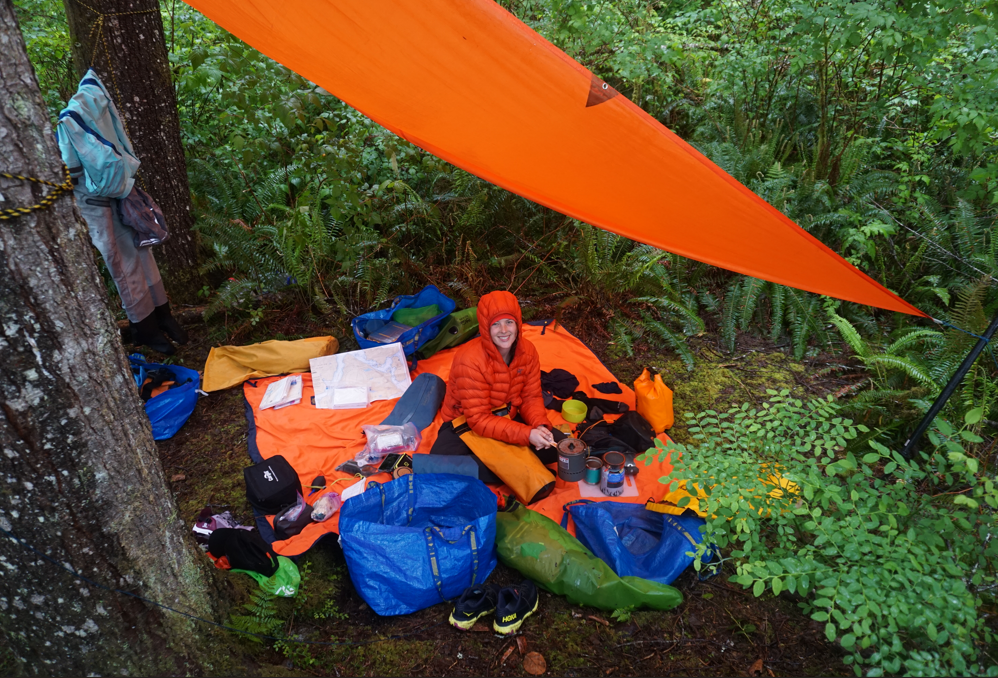 Compared to our mountaineering adventures, sea kayaking allows a level of luxury I still struggle to comprehend. We stripped off wet drysuits for dry clothes, pitched a tent and a tarp, laid out our picnic blanket, set up our double sleeping pad and sleeping bag complete with sheets and pillows before digging into some left over Thomas Haas wedding cake. Rain battered our tarp but we stayed cozy and dry.