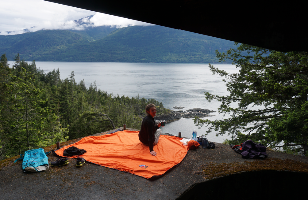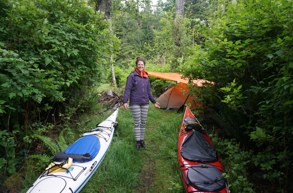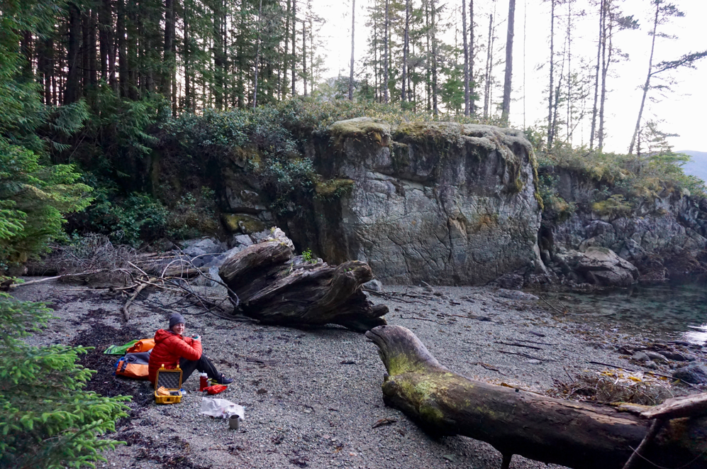 A few BCMTN sites exist in the area, but they all appear to be at old log dumps – not too appealing to be honest. We pulled into a small bay tucked behind Tucker Point. There was evidence of previous use and no signs indicating private property. A sheltered beach with easy gravel landing led to a cleared upland area, where we hung our gear and pitched our tent for the first time without a tarp!