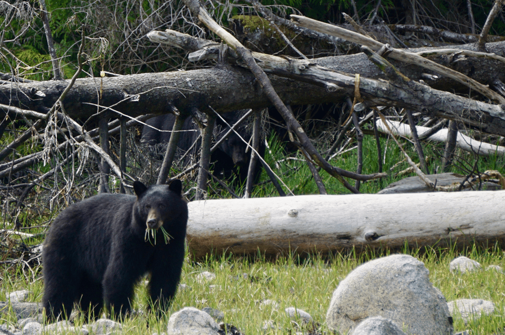 We were so fixated on the healthy, beautiful bear feeding along the shore that we failed to notice the largest black bear either of us have ever seen lurking in the shadows.