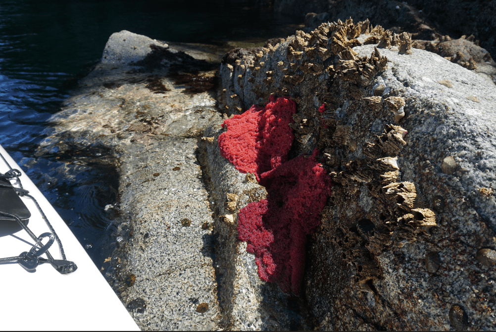 After spending some time photographing the pictographs in Port Harvey, we paddled along the shore checking out some of the quaint homes and then floated and had some snacks in the boat. We paddled out of the Port, finding a few more scattered pictographs and then crossed through the Bockett Islands to Whitepoint Beach, stopping for water along the way.
