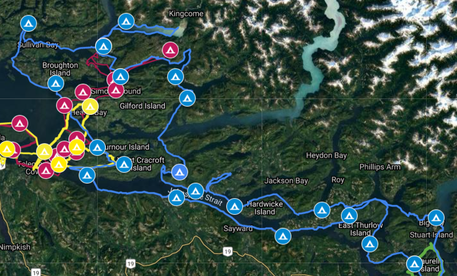 Trip route in blue – linking previous trips we have done in green (Discovery Islands), red (Central Coast & Cape Scott), and yellow (Broughtons).