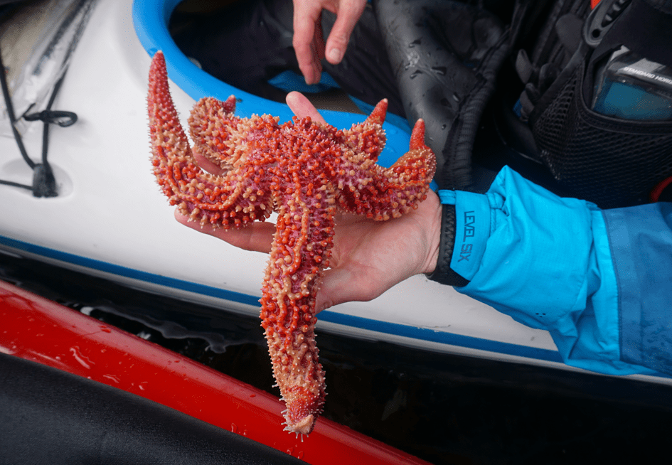 We planned for another long day in Johnstone Strait and were dismayed to hear more SE wind forecast on the radio. It was only forecast to reach 15kn, but it was demotivating regardless. We launched easily from our pebble beach and enjoyed the crystal clear waters along the shore. We identified numerous species of sea star, including sunflower stars, striped sun stars, and painted stars. The intertidal life was phenomenal.