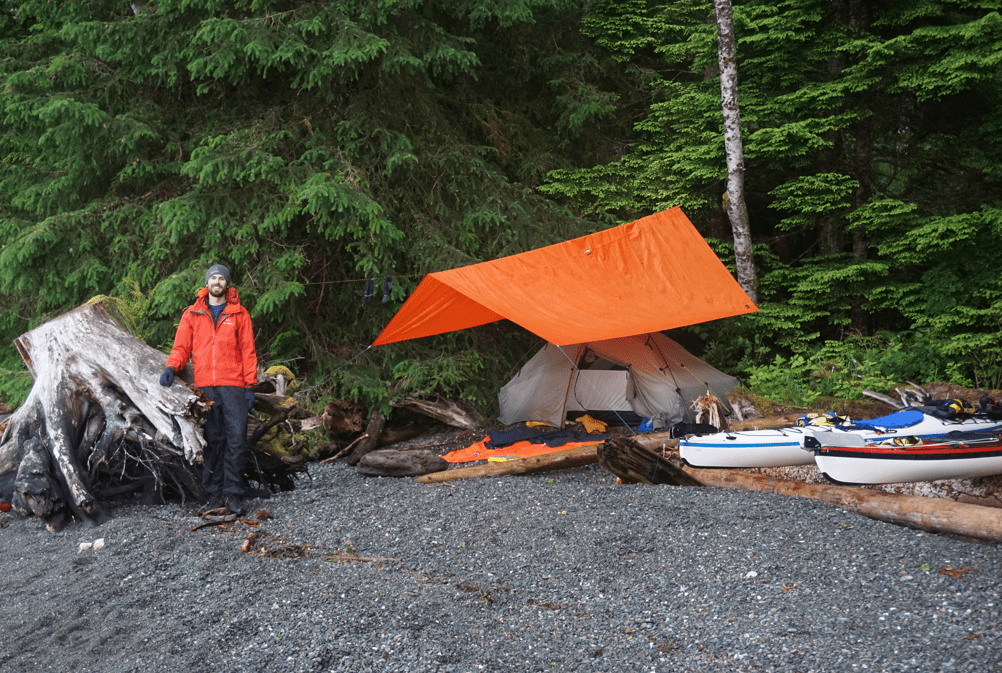 We continued until we reached the nice pebble beach and pulled our boats up. We explored the beach and luckily pulled our boats just high enough to escape being washed away by the wake of the Alaska Ferry as we wandered down the beach. We scoped out the area mentioned by BCMT as cleared upland, but decided to camp on the far end of the beach on the gravel. We pitched the tarp for the last time of the trip and popped a few Advil.