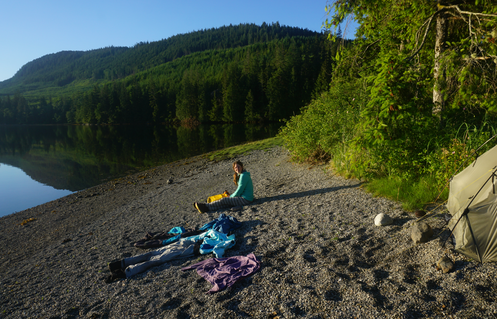We debated stopping at a small sandy beach in the Adams River estuary, but were unsure of the Reserve boundaries. We continued on for about 3km further past Adams River. We found a small patch of pebbles that would hold a tent between piles of driftwood and set our alarm for high tide. This was our second random beach camping in Johnstone Strait – we knew there was a suggested BCMT site around, but we had somehow missed it.