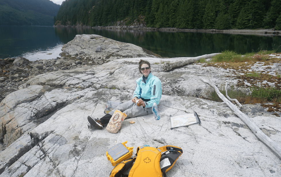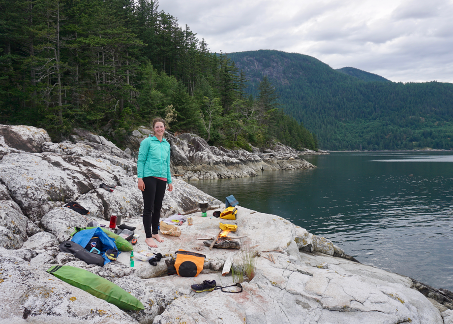 L and I pulled into Basset Bay on the east side of Stuart, only to find a group of more than 10 campers! They had transited Arran Rapids in the morning in ocean canoes and were out for another week. I would run into them in a few days near East Redonda Island. We exchanged information and made polite chit chat, but we were keen to spend the last night of our trip alone. We paddled off to try some rock bluff camping – not something I recommend in the area, but we were almost out of food, so the boats were easy to unload and handle.