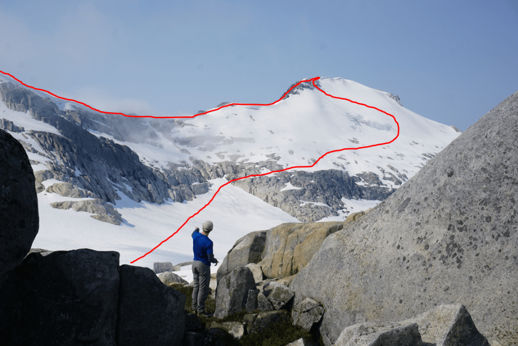 Scoping out the route to Cando Peak from camp. We followed the ridge on the left and descended down the face. Most of the difficulties are in gaining the ridge – out of the photo on the left.