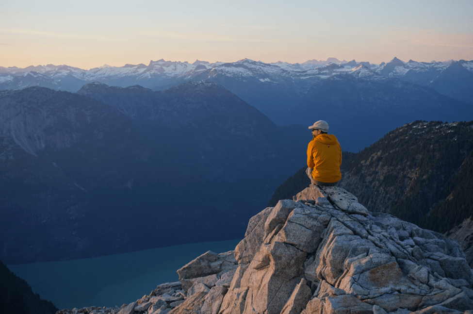 Daniel enjoying the sun set over Toba Inlet from a perch near camp.
