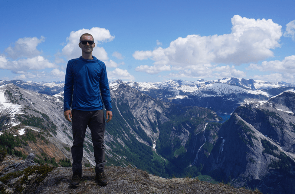 Ben on the summit of Bremmer Peak with Cando Peak and Daniels Lake behind.