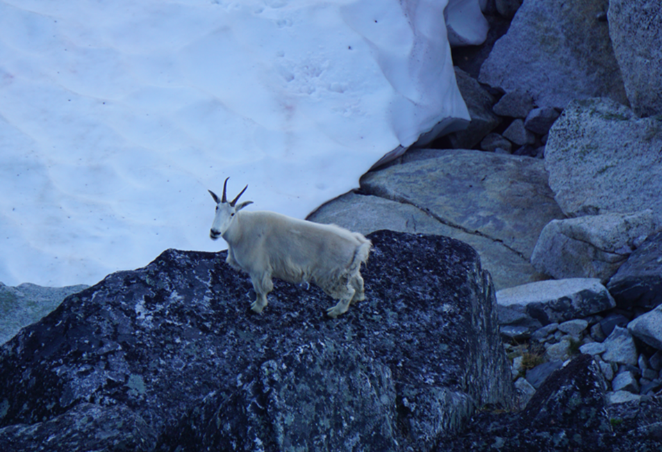 The entire way to Flipper Peak, the ridge offered tremendous views of the Daniels Valley and Lake and the peaks to the north of Toba Inlet. This was a stunning morning with amazing visibility. We left camp with high energy and hiked down the narrow ridge towards Flipper Peak. The ridge broadened after a few hundred meters and we enjoyed an easy stroll to the summit of Flipper. We saw one of the few mountain goats that we would see on the trip.