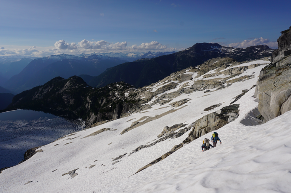 We descended to our bags at the col, tried to satisfy our continual hunger, and then booted our way back down the glacier. The return along the ridge was uneventful, but we did take a few minutes to scramble up Cluney Peak from some more views of Daniels Lake.