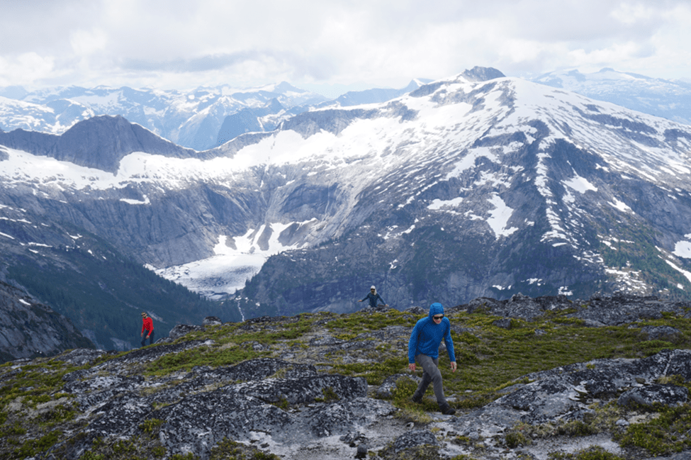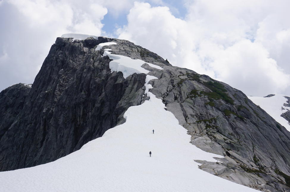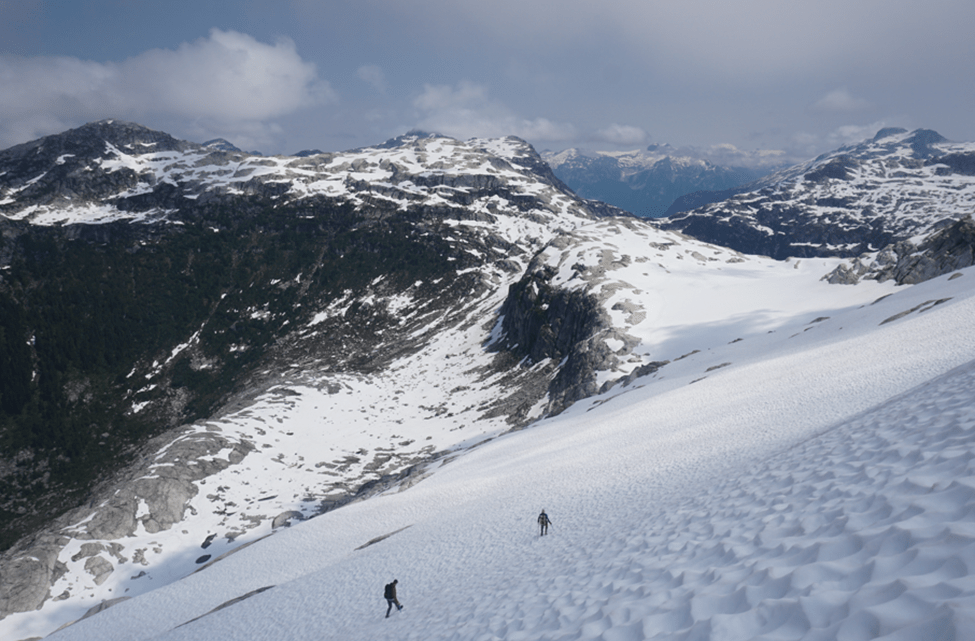 After stopping for snacks and water on the summit of Flipper and enjoying the views, we continued our leisurely stroll along the ridge towards Endspur Peak, which dominated the skyline. A few kilometers west of the summit of Flipper, the ridge splits and we took the south fork. The ridge up until this point was broad and the walking was easy. Countless tarns and stunning views of the Daniels Valley and Toba Inlet kept us moving at a slower pace – we also knew what was waiting for us in a few hours time!