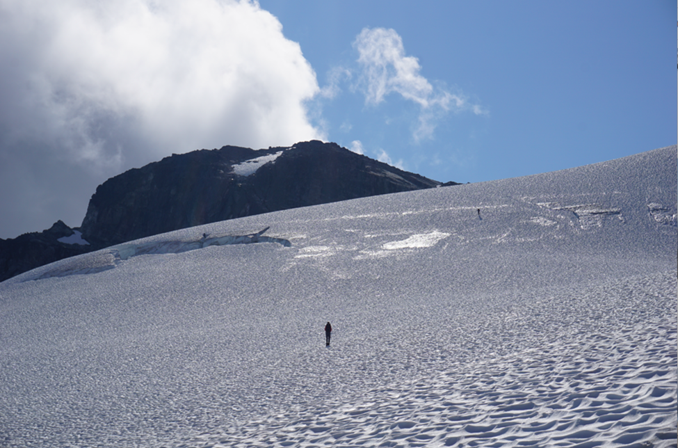 After taking a short rest on Nolan Peak, we lost a bit of elevation and found ourselves at the base of the NW face of Brighton Peak. We stopped here to check out the route. The recent heat had melted a lot of snow, but the glacier still had decent coverage. We had left our rope at the col and Ben discovered he had forgotten his crampons. We elected to do a large switchback across the glacier, avoiding the main crevasse on the face, but when Daniel, Andrew, and I looked up from putting on our crampons, Ben was charging a line straight through up the face.