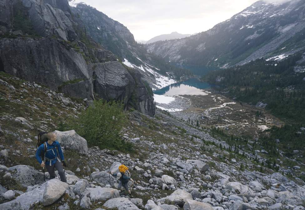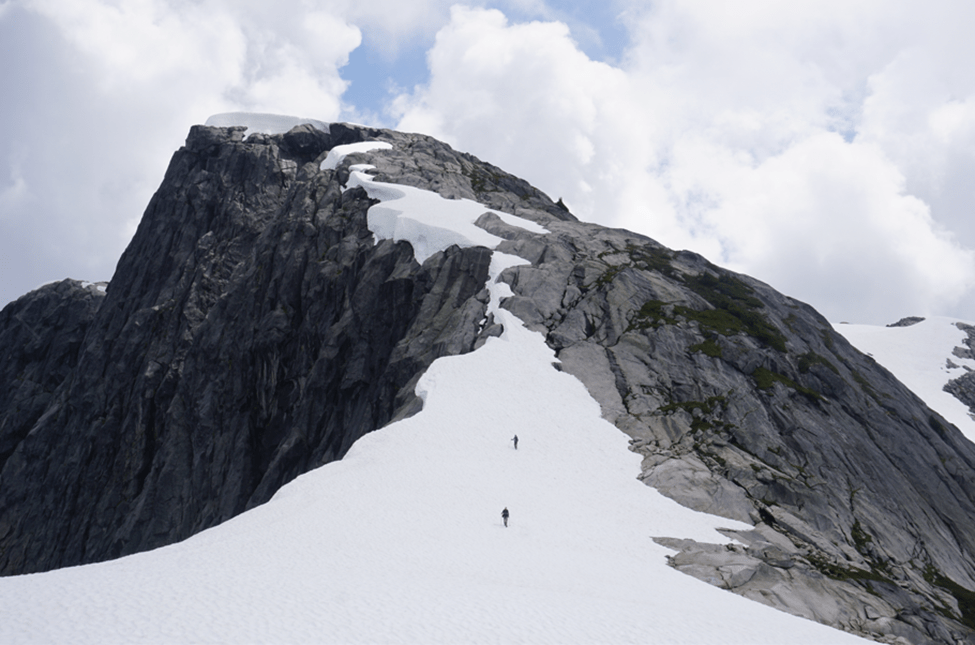 We were at the end of a massive heat dome in BC and the temperature was already in the 30s. We found water and rested in the shade of our boulder camp before packing up and moving on. After a lazy morning and already feeling zapped from the heat of the day and our late night, we decided to forgo Brighton until the following day, move our camp to a better position, and head out towards Julian and Chusan Peaks.