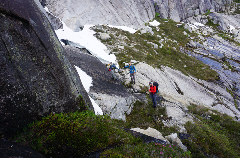 We set off for the minimal elevation gain to the summit just as Ben and Andrew were returning. They settled into breakfast and coffee while we scrambled up mellow terrain to Tinghai Peak. There was not a cloud in the sky and the views were phenomenal. Our route to the ocean stretched out before us. We made quick work of the return and were soon back at the tarn breaking down our camp.