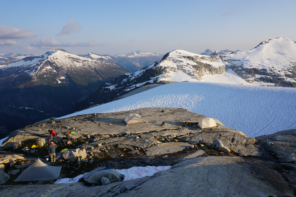 We had amazing views of Toba Inlet from camp and after hot drinks and dinner, we sat and enjoyed the sun setting over the inlet. The crux of the first part of our trip was behind us now. Our second crux – Mount Denman – still loomed on the horizon, but instead of dreading it, we were all looking forward to it.