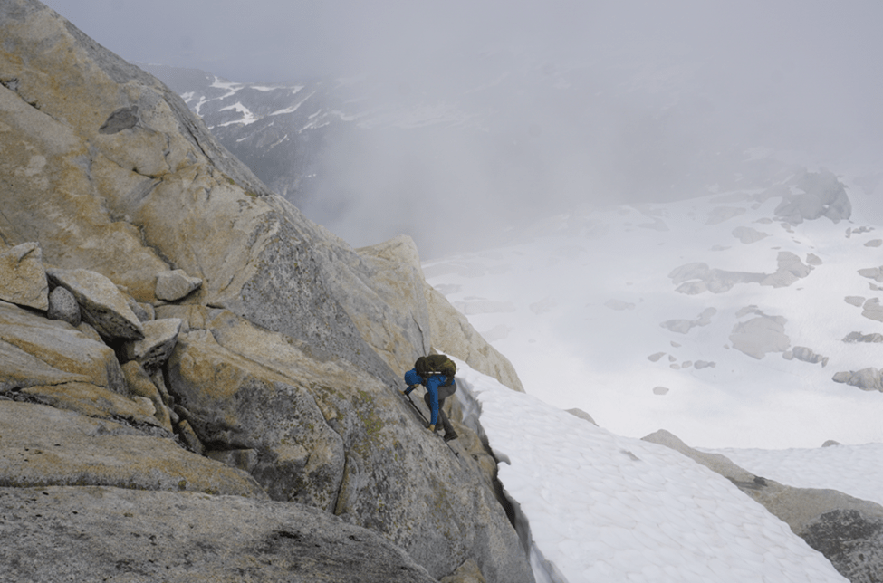 Our original plan had been to go up and over Tinghai Peak (the next bump on the ridge), but the ridge looked tricky and we saw continuous snow on the north side that looked like an easy alternative. We decided to traverse below the summit. This was a great decision as we were tired and the terrain on the ridge would have been difficult with the heavy bags. We made quick time on the traverse and remerged on the ridge just to the west of Tinghai Peak.